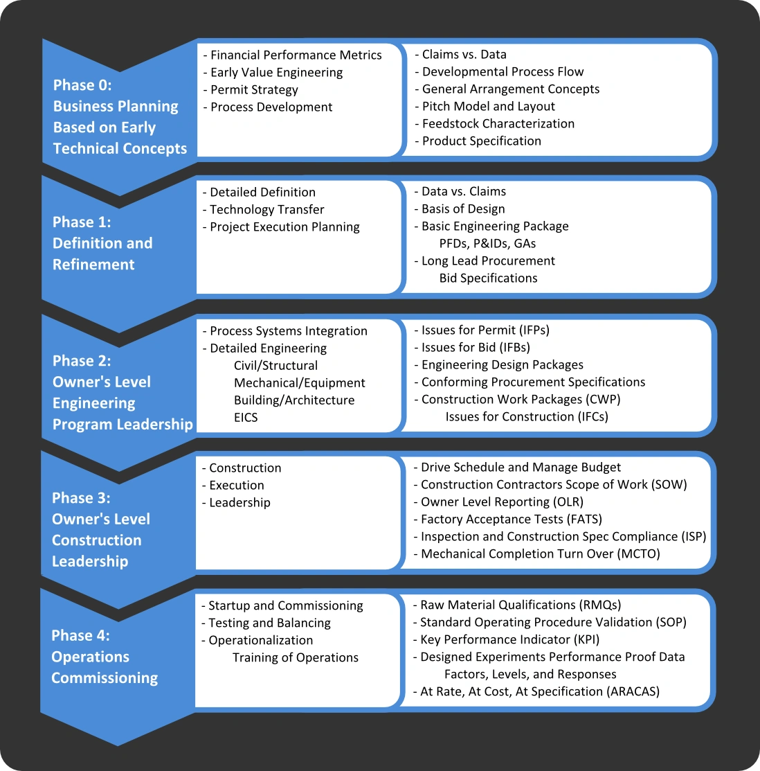 To develop basic engineering packages including commitment grade cost estimates and the owner’s level project schedule for the detailed engineering, construction management, and operations commissioning we first engage in detailed learning and refinement of scope. This is commonly known as Phase 0 where activities include idea exploration, concept investigation, experimental data generation, proof of principle runs, and both individual equipment scale up and integrated system scale up.